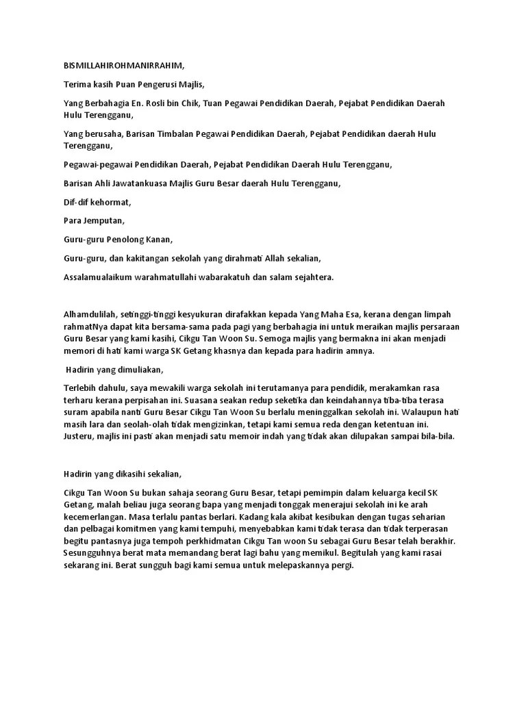 Teks ucapan majlis persaraan pengetua guru besar guru wonderful farewel oration for colleague teks ucapan persaraan di bawah ialah ubahsuaian ucapan bersara guru. Assalamualaikum warahmatullahiwabarakatuh / selamat petang selawat terima kasih saudara pengerusi majlis ~ yang .